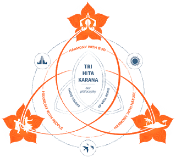 The phrase Tri Hita Karana comes from Sanskrit and can be translated as “three causes of well-being” or “three reasons for happiness.” It is built on three essential relationships that must be maintained in balance: harmony between humans and the divine, harmony among humans, and harmony between humans and nature.